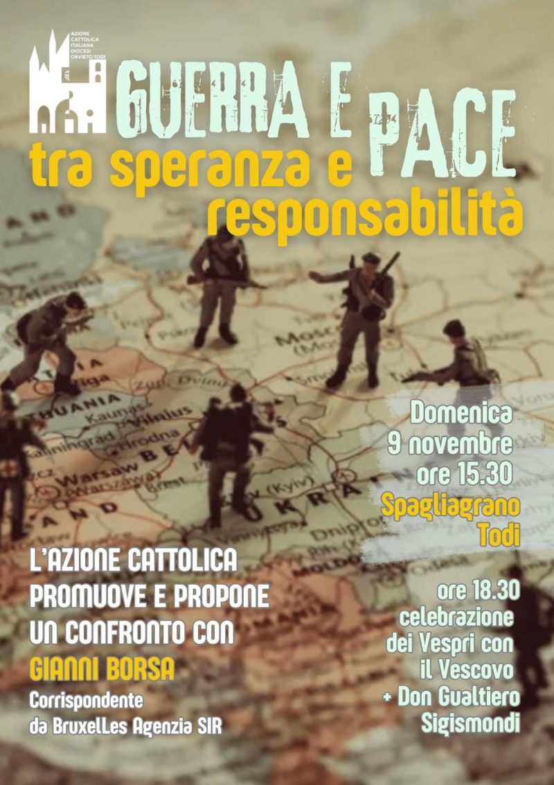 L’Azione Cattolica della diocesi di Orvieto-Todi propone un momento di riflessione dal titolo “Guerra e pace: tra speranza e responsabilità”, in programma domenica 9 novembre alle ore 15:30 presso al Casa Diocesana di Spagliagrano. L’incontro vedrà il confronto con Gianni Borsa, corrispondente da Bruxelles dell’Agenzia SIR, sul tema attuale dei conflitti e dell’impegno per la pace.