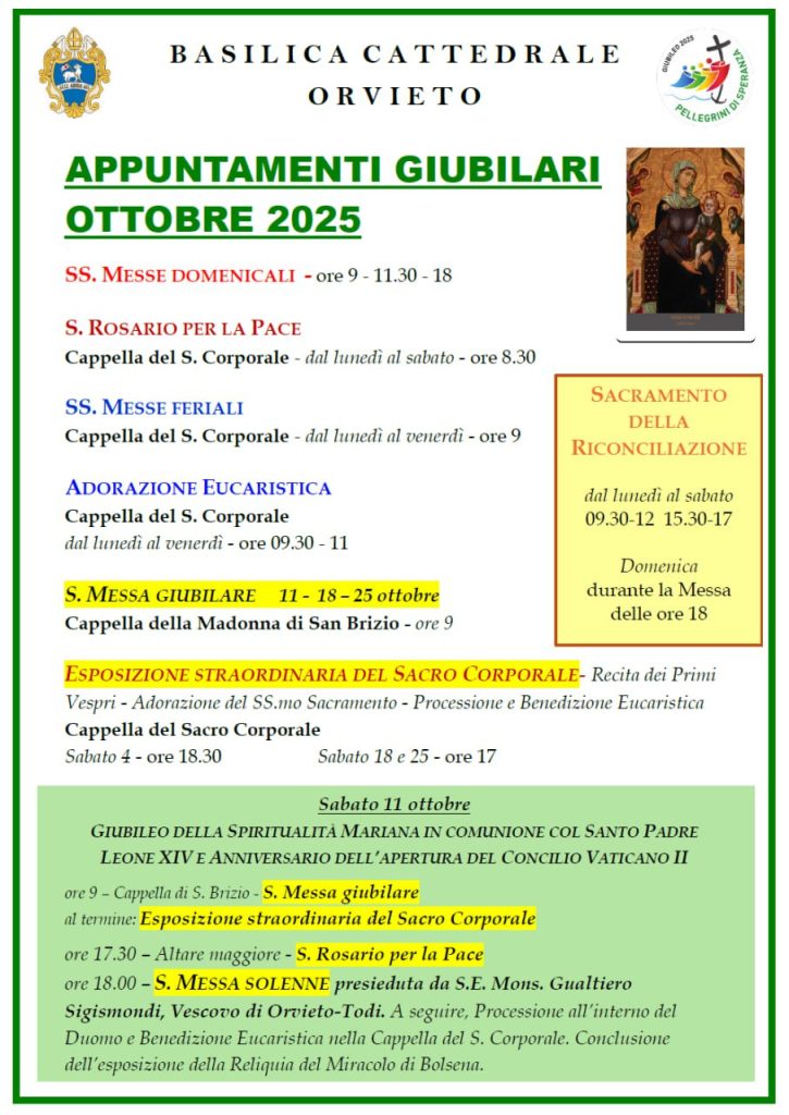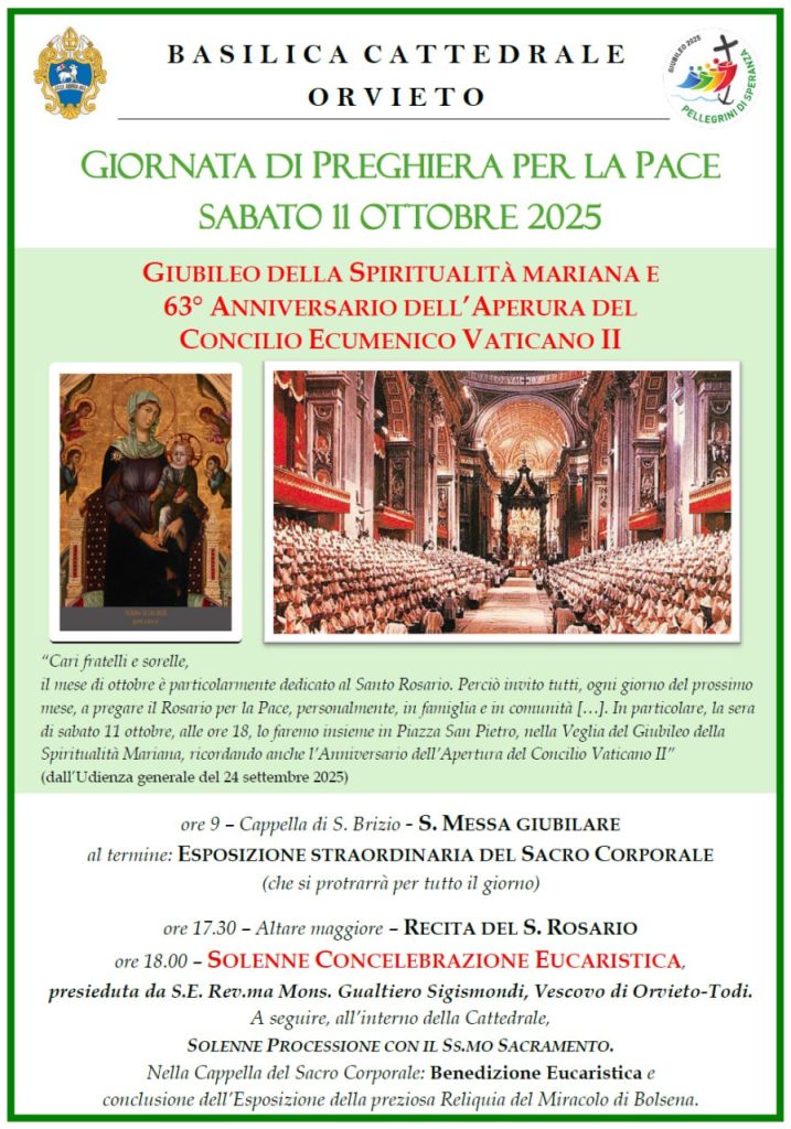 Sabato 11 ottobre, alla vigilia del Giubileo della Spiritualità Mariana, seguendo l’invito di papa Leone XIV, il Capitolo della Cattedrale di Orvieto promuove una Giornata di Preghiera per la Pace.
