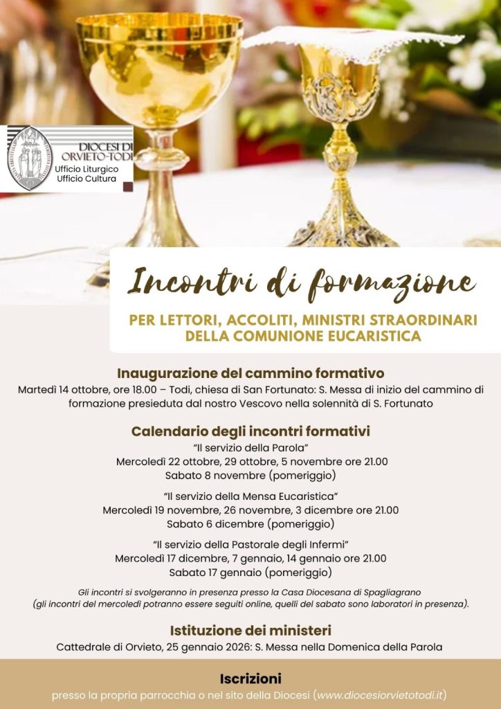 L’Ufficio Liturgico e l’Ufficio Cultura della Diocesi di Orvieto-Todi presentano la proposta formativa che tutti gli interessati, d’intesa con i rispettivi Parroci, dovranno intraprendere al fine di poter ricevere e svolgere il servizio di Lettore, di Accolito e di Ministro straordinario della Comunione nelle rispettive unità pastorali e parrocchie di appartenenza.