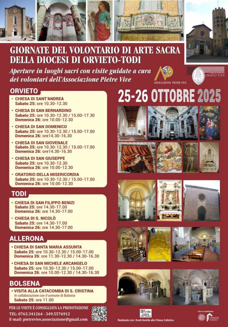 Come di consueto anche quest’anno nel mese di ottobre ritornano le Giornate del Volontario di Arte Sacra proposte e organizzate dall’associazione diocesana “Pietre Vive”.  L’iniziativa, che si svolgerà nelle giornate di sabato 25 e domenica 26 ottobre, è realizzata con i contributi 8xMille della CEI alla Chiesa Cattolica e della Fondazione Cassa di Risparmio di Orvieto, la collaborazione della Diocesi di Orvieto-Todi, dei parroci e, soprattutto, grazie all’impegno e alla disponibilità dei volontari dell’Associazione.