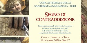 Nel pomeriggio di domenica 18 ottobre, alle ore 17:00, presso la Basilica Concattedrale di Todi, avrà luogo l’inaugurazione dei lavori di restauro di tre opere d’arte recentemente recuperate e restituite alla fruibilità di cittadini, studiosi e fedeli. Prima ancora che opere d’arte o pezzi da museo, esse sono infatti testimonianze di fede: per questo si è scelto di collocarle all’interno della Concattedrale, con cui tutte … Leggi tutto “Segno di contraddizione”: presentazione dei restauri di tre opere d’arte nella Concattedrale di Todi